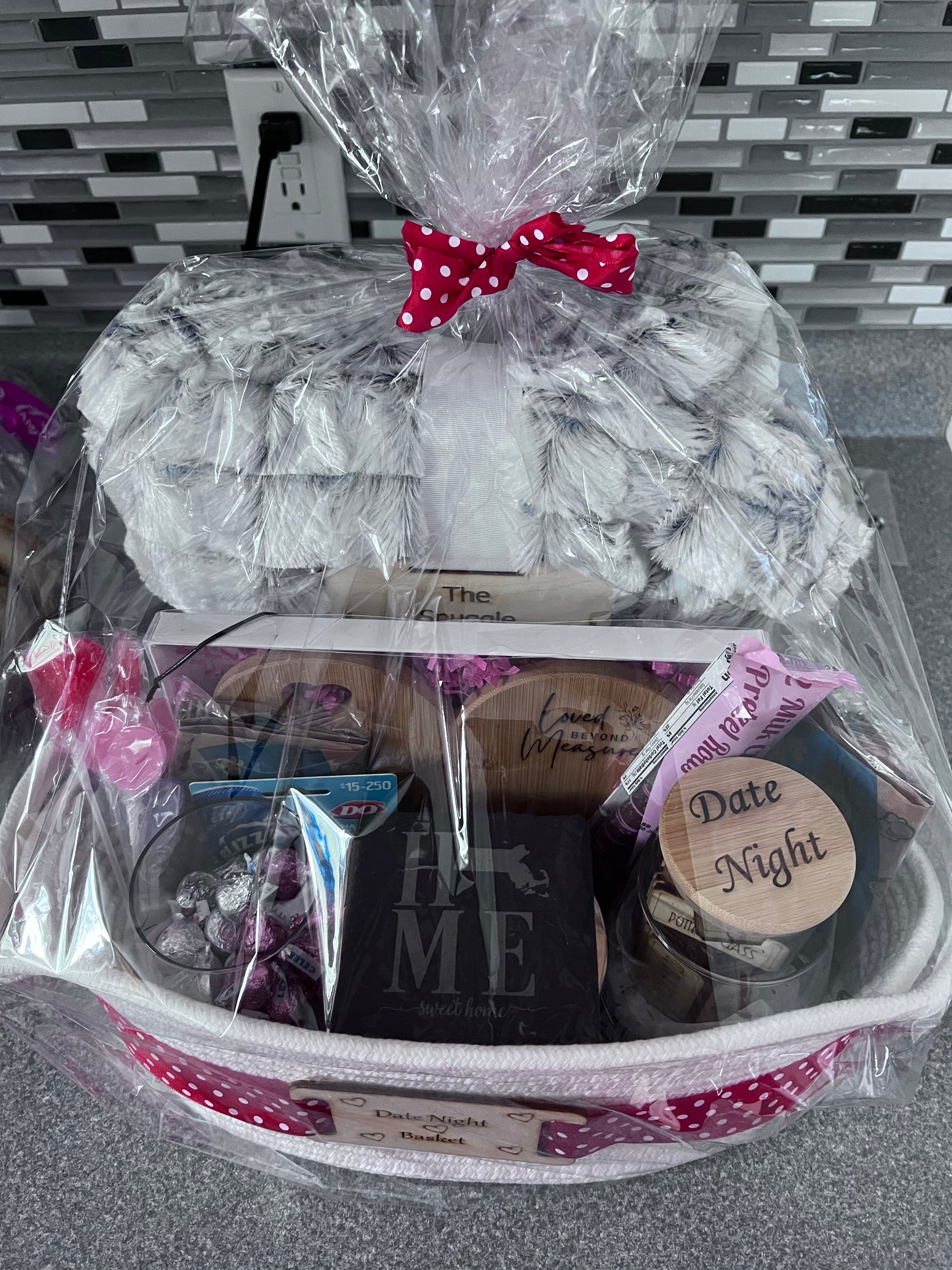 Basket with wood tag and ribbon. Inside basket includes blanket with date night tag, date night glass jar with 35 Date night ideas, 2 wine tumblers with candy inside, 2 slate coasters, a few various Valentine themed snacks, 1 scented candle (scent varies), as well as a heart charcuterie board & 2 tools, with Valentine message engraved.