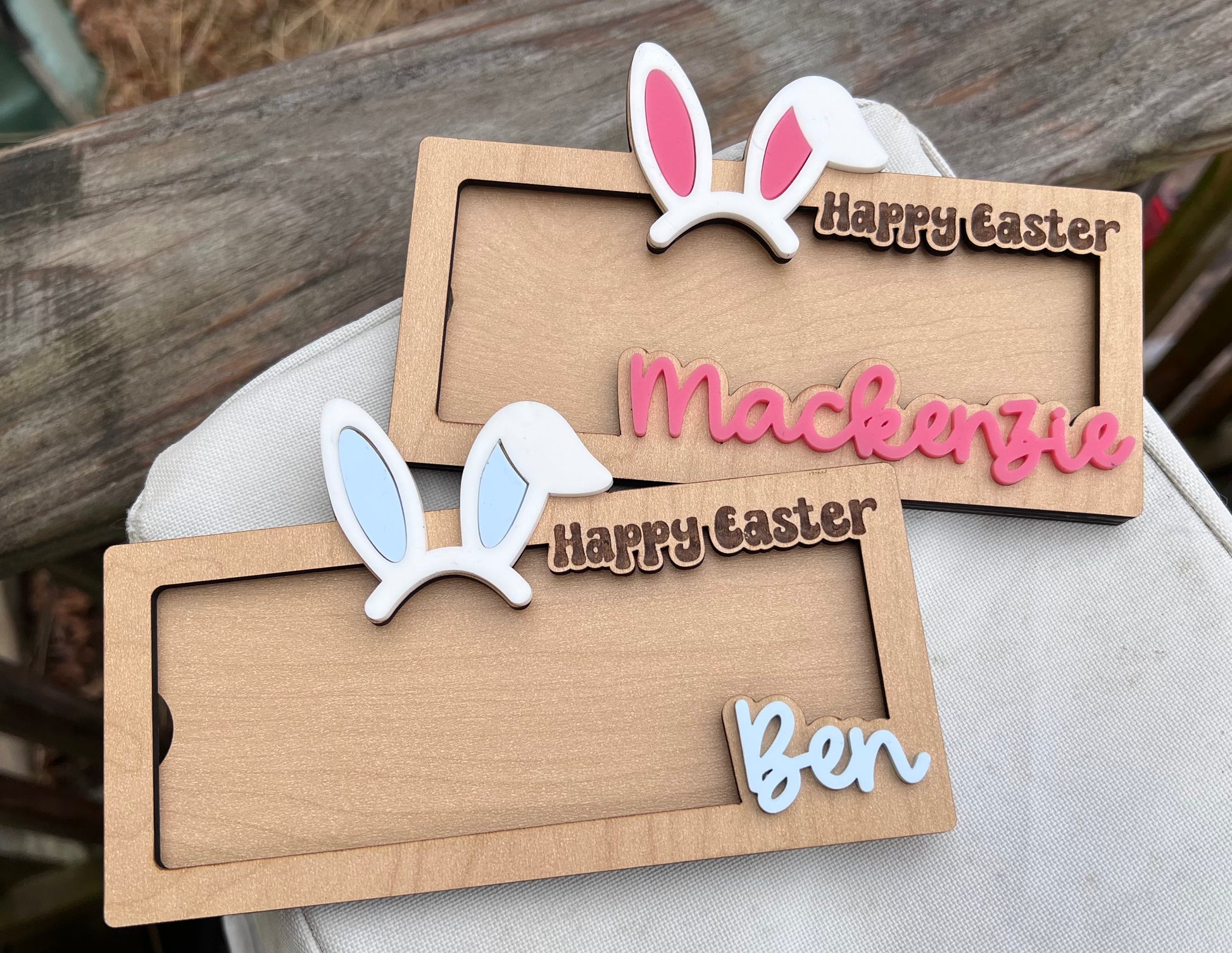 Grab this personalized wooden money holder (acrylic ears and name) for your kids this Easter!!