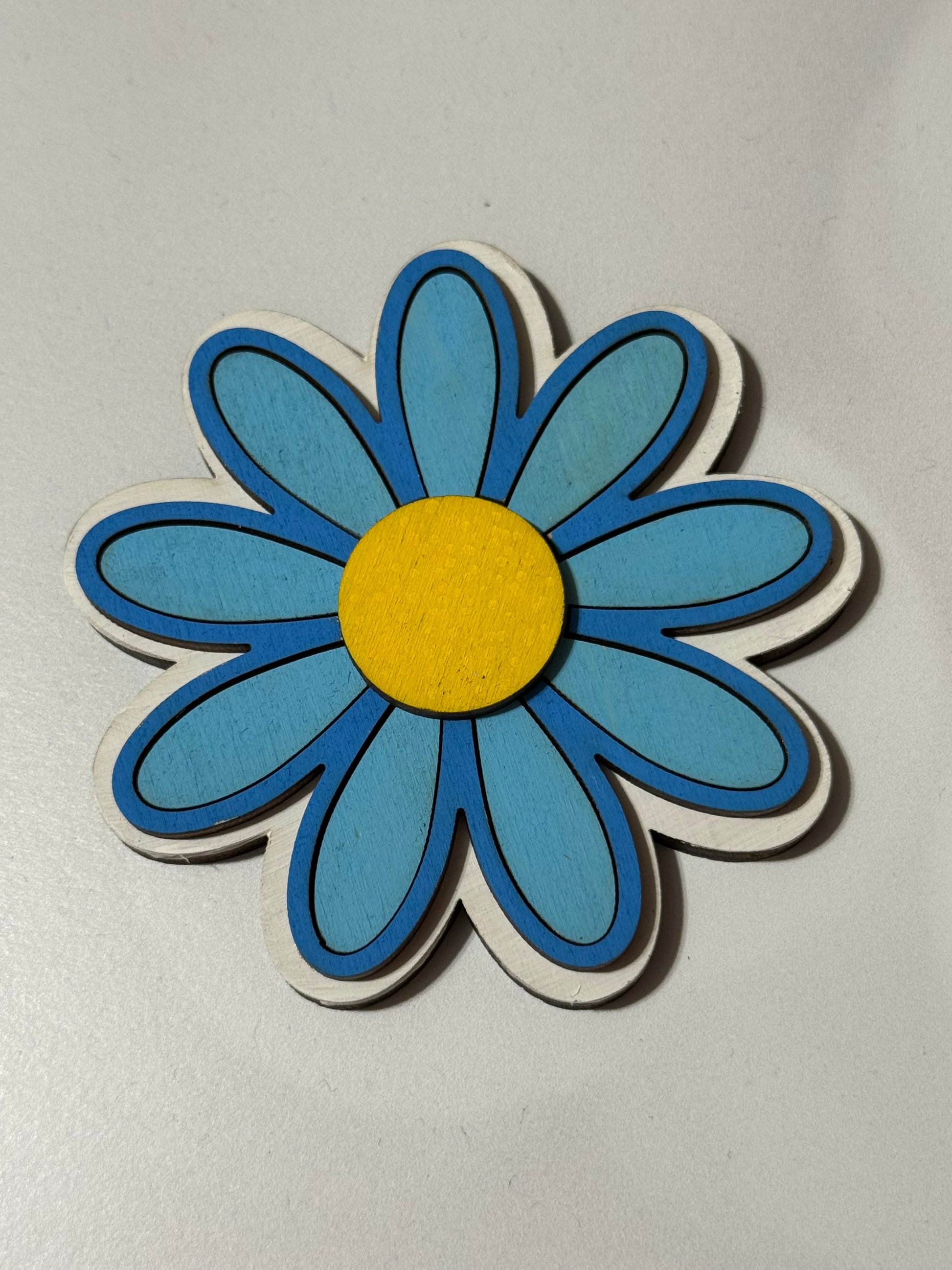 Unpainted 3 layer flower with peelable 3m backside on the top 2 layers to allow for easy application (and also no need for glue!). Will include a small round easy peel Velcro to apply to use with sign!
