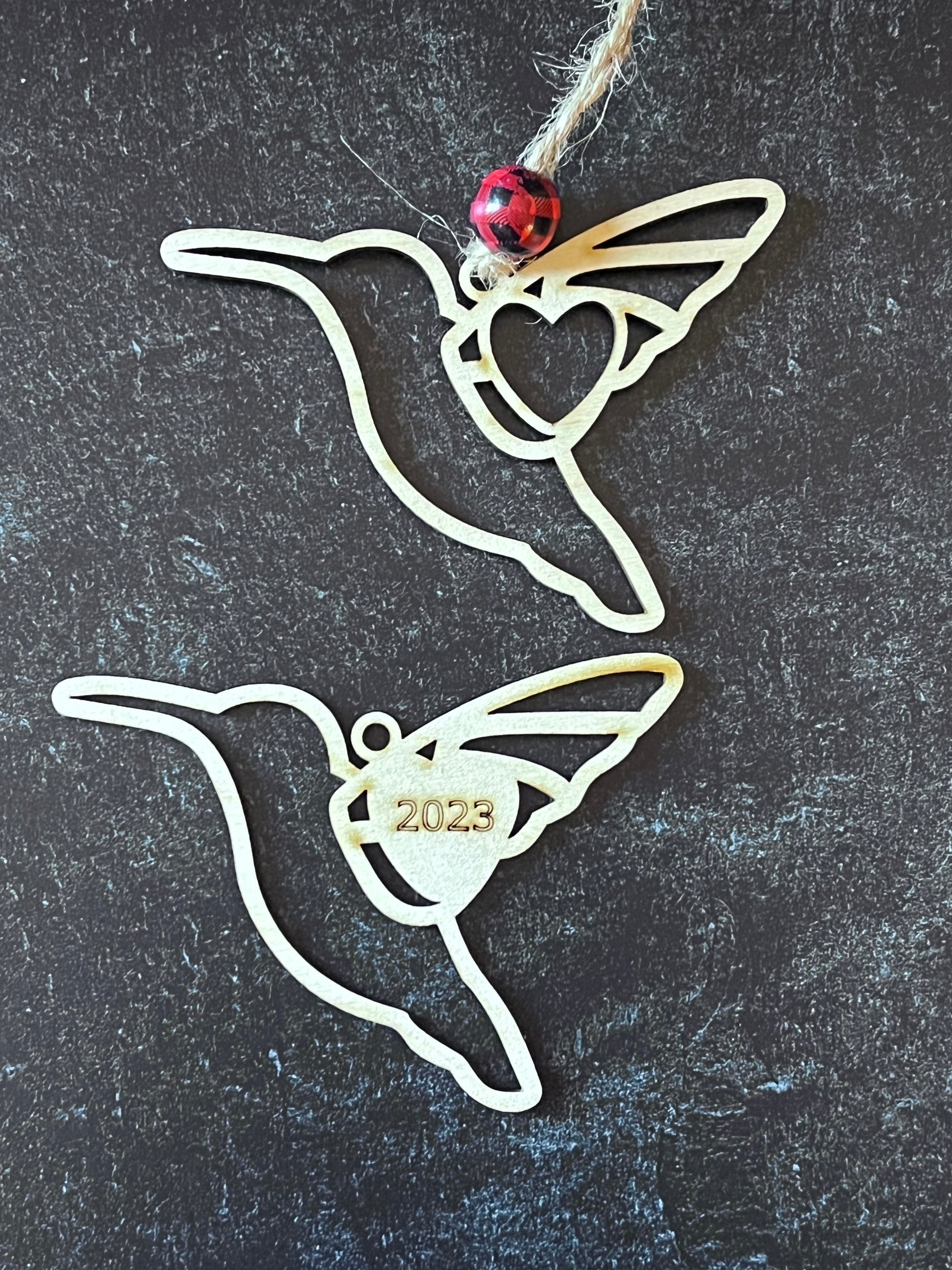 Hummingbird ornament, can include date if wanted. Comes ready to gift in a white gift box with a black elastic ribbon.