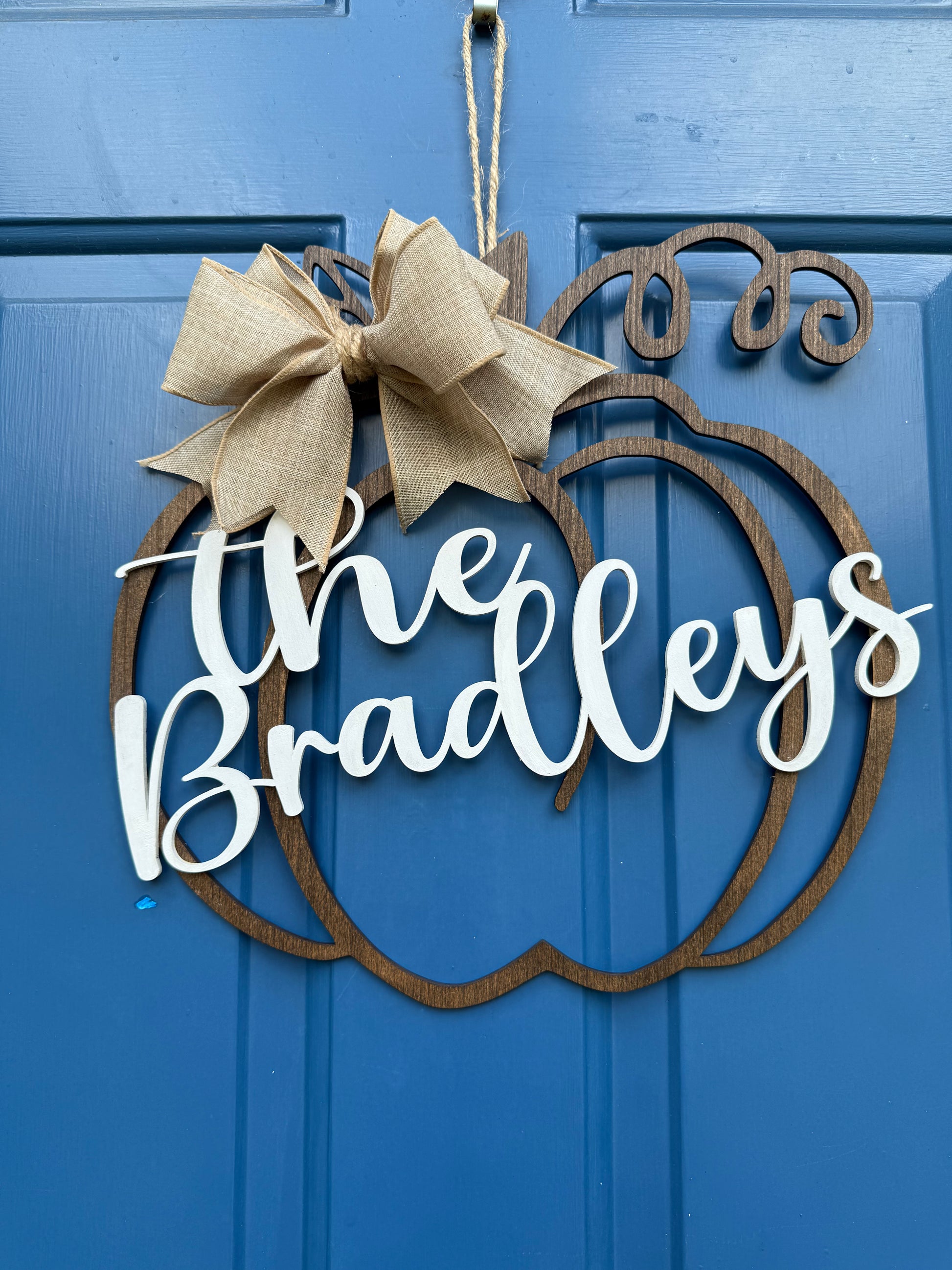 16” personalized wooden pumpkin door hanger with family name attached on top.
