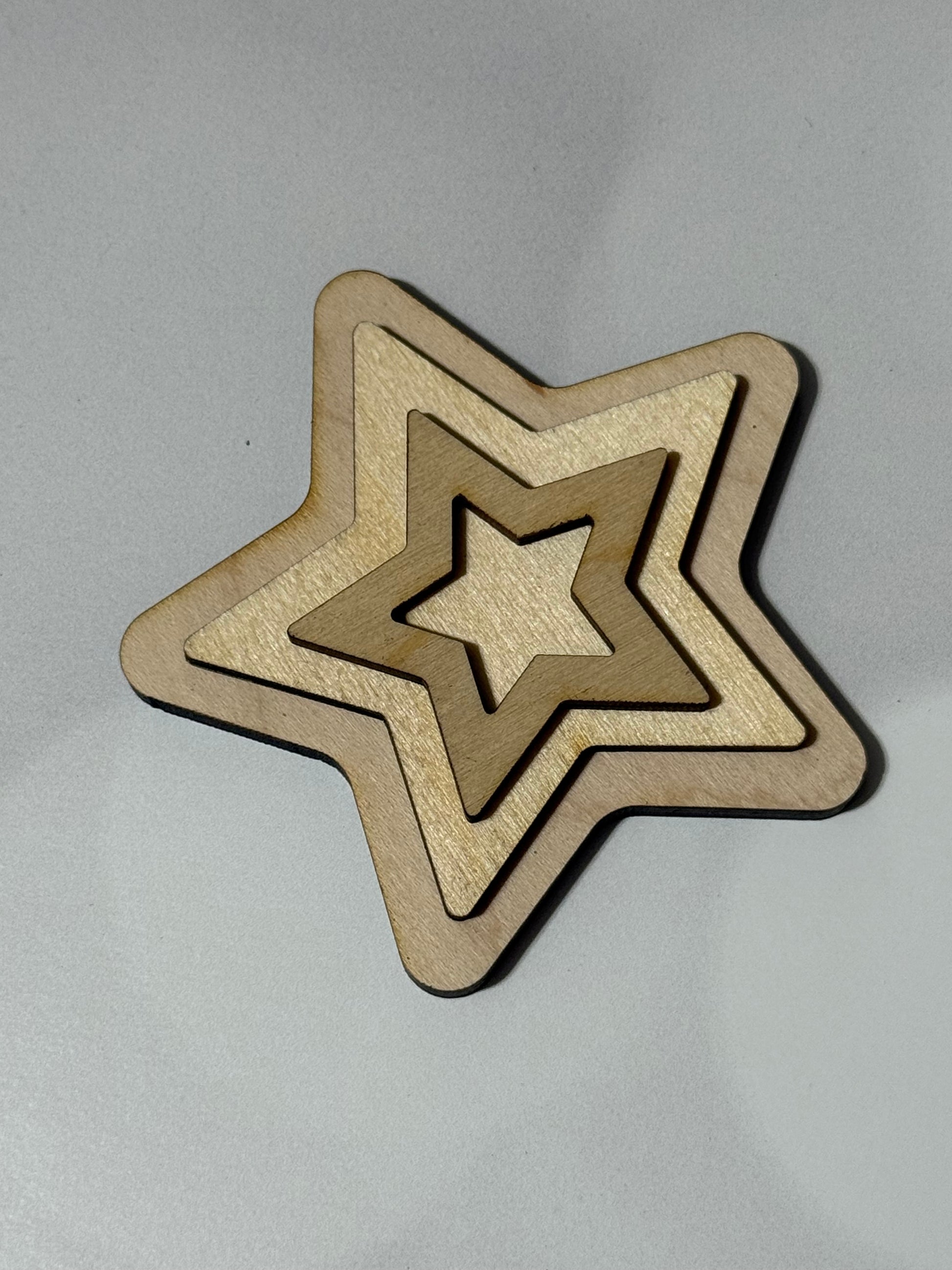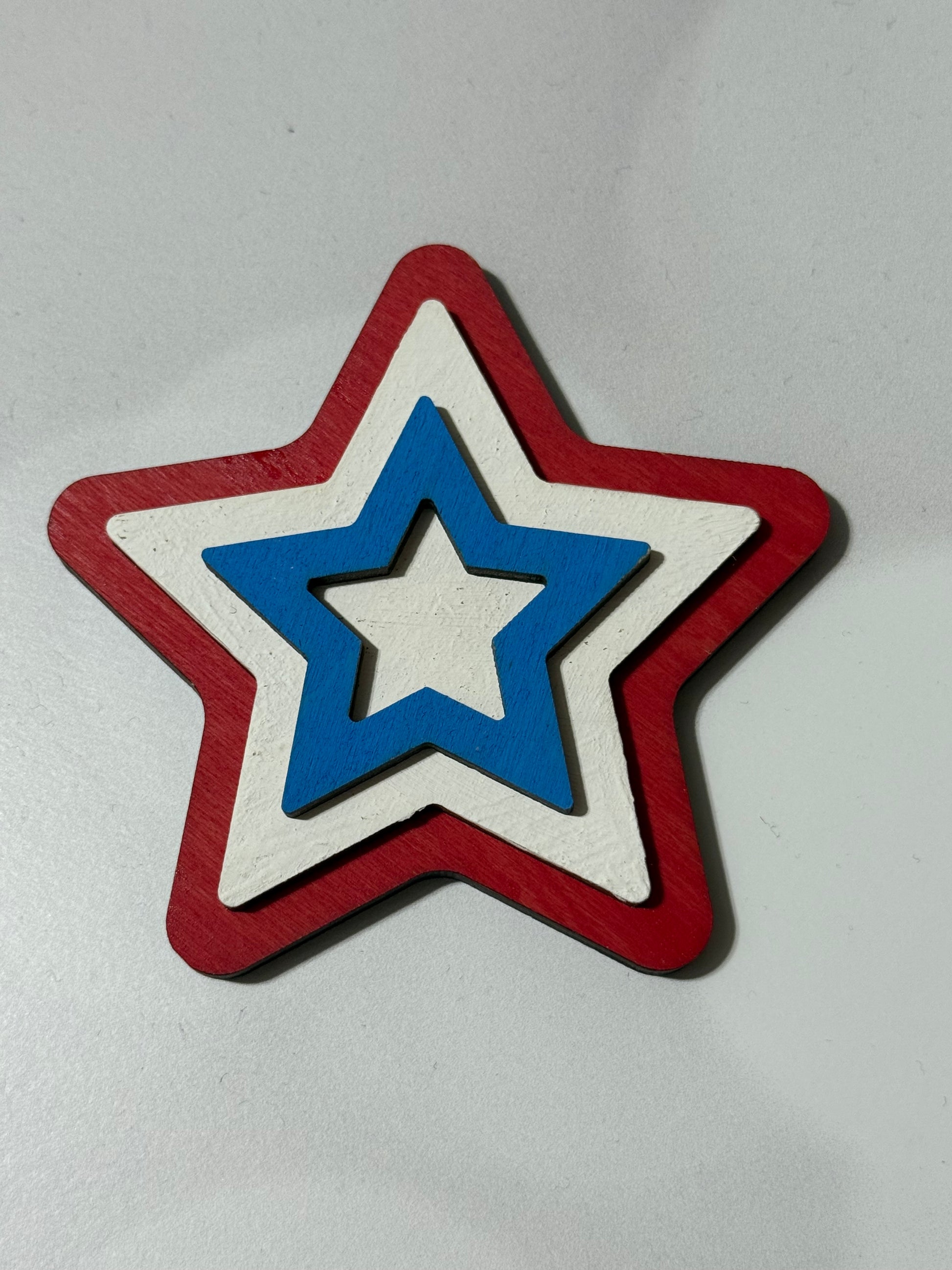 Unpainted 3 layer star with peelable 3m backside on the top 2 layers to allow for easy application (and also no need for glue!). Will include a small round easy peel Velcro to apply to use with sign!