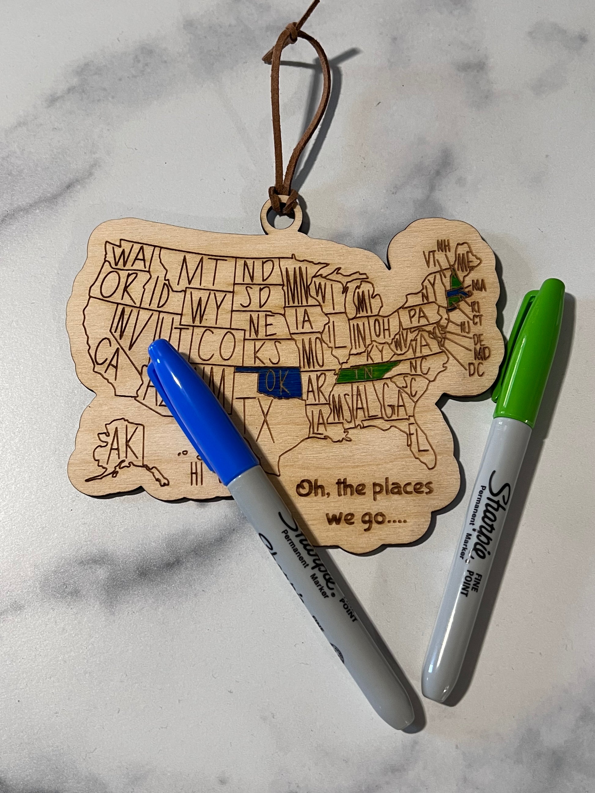 You may color in the states with Sharpies or Acrylic Paint Pens. However, nothing is included with the ornament-must find your own coloring instruments for this Ornament.